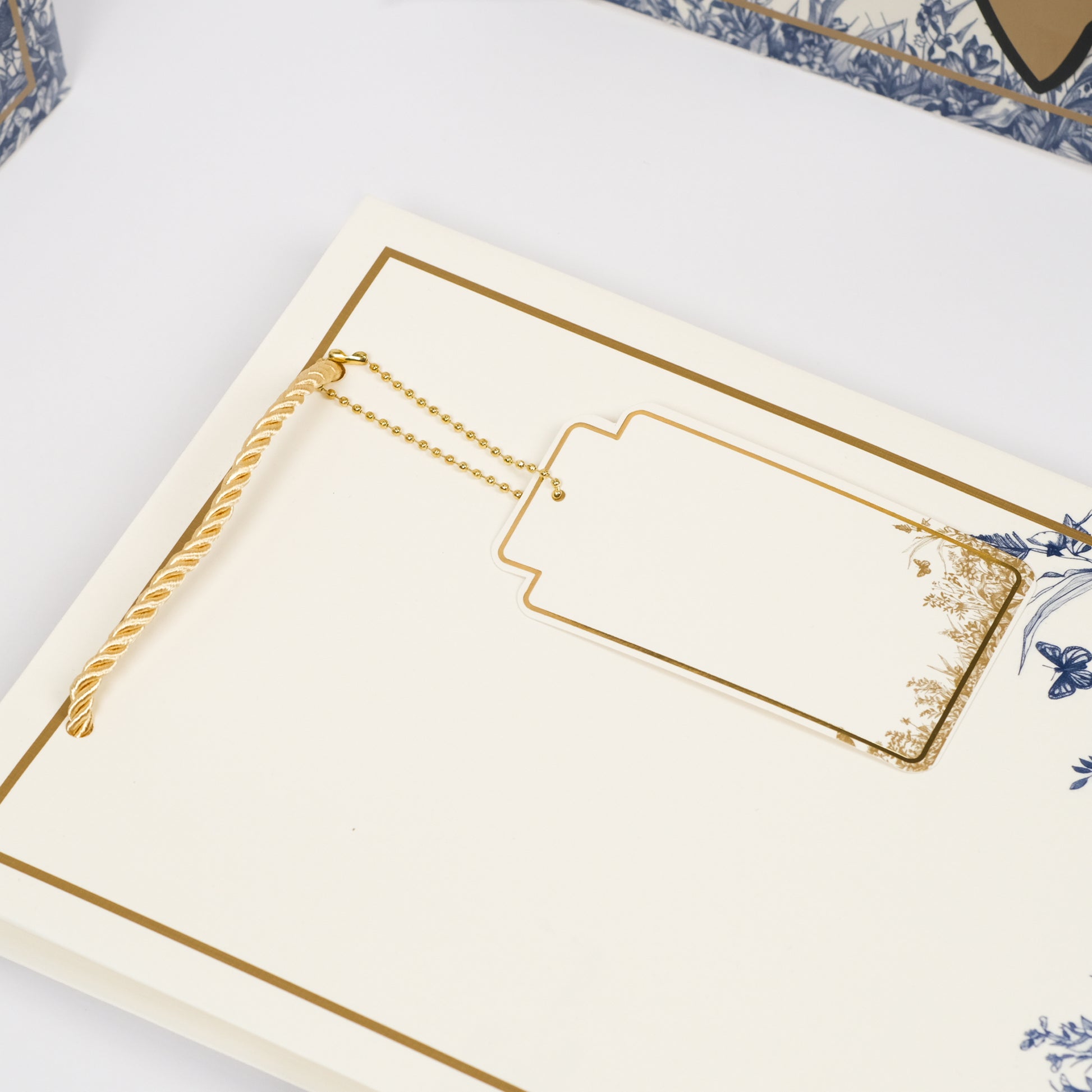 Add a touch of sophistication to your gifting with this premium gift bag. Crafted in a soft cream tone, it features a delicate blue floral and butterfly design along the bottom edge, giving it a timeless and graceful look. The bag is accented with a fine gold border that frames the front beautifully, while the sturdy golden rope handles ensure easy carrying.
