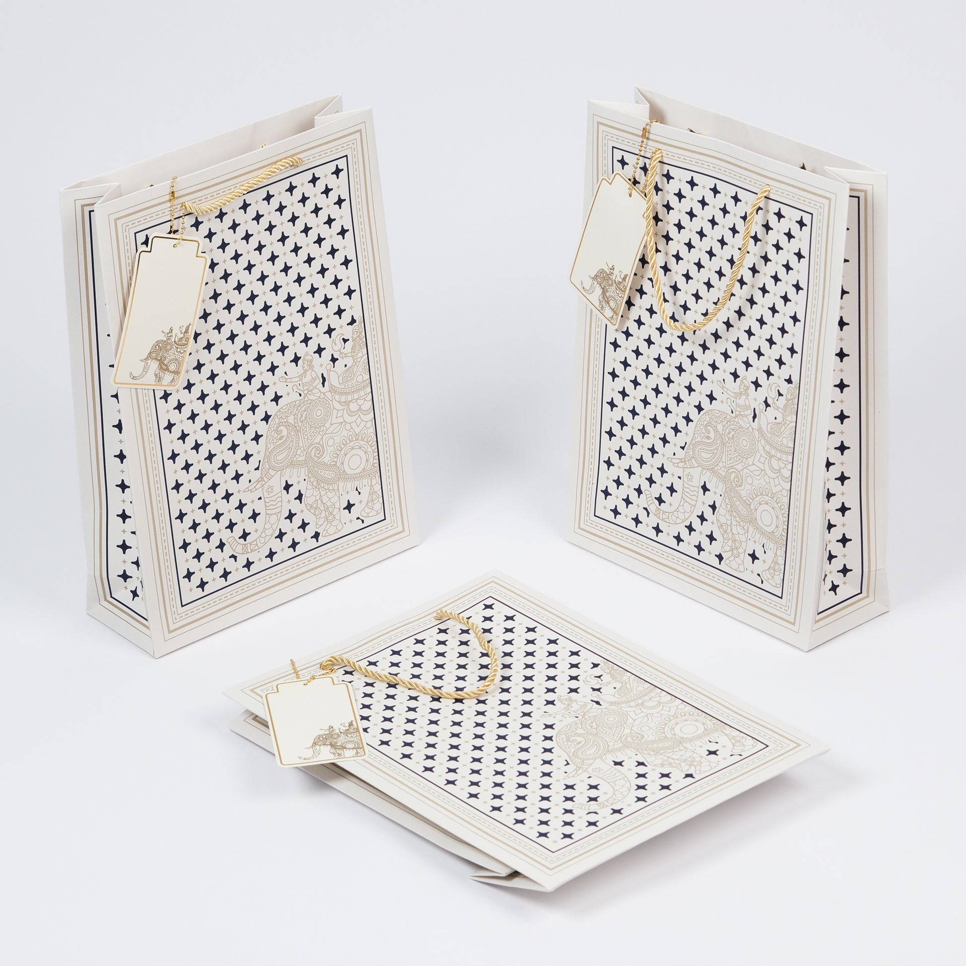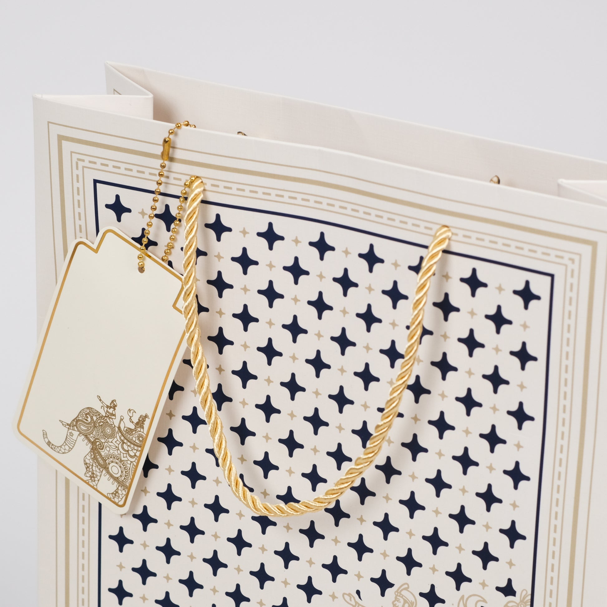 These premium paper bags feature a subtle off-white background adorned with a stylish blue ornamental pattern. Equipped with twisted golden rope handles, they combine elegance with ornamental charm, ideal for upscale gifts, luxury items, and festive events. Their sophisticated design enhances any gift presentation while providing reliable strength.