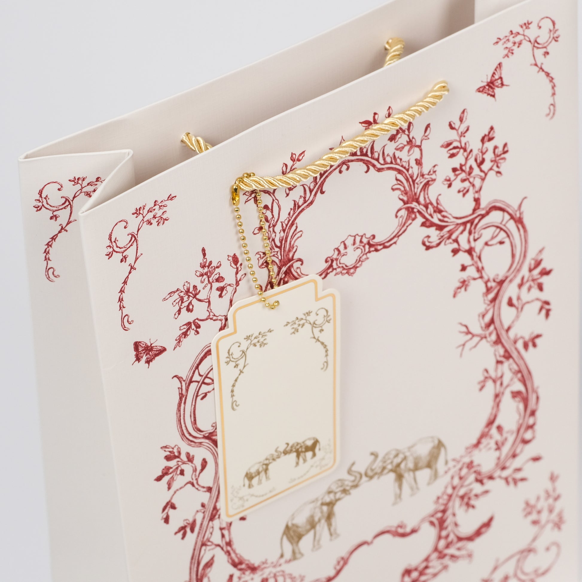 These luxury paper bags showcases an off-white base highlighted by an elegant red floral and ornamental frame pattern on both the sides. Featuring twisted golden rope handles, these bags marry sophistication with decorative appeal, making them perfect for premium gifting, luxury products, and festive occasions. Their refined design elevates any presentation while offering practical durability.
